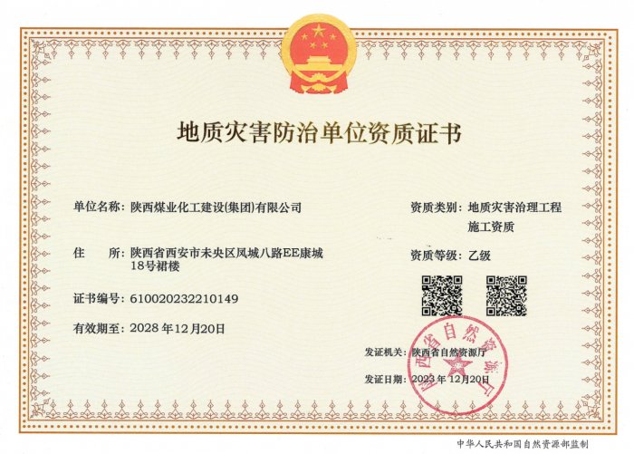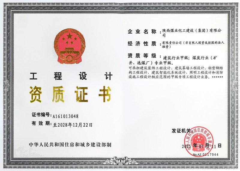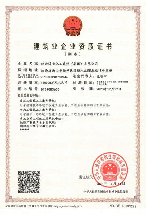 擁有建筑工程施工總承包、礦山工程施工總承包“雙特級”資質和建筑行業甲級、煤炭行業(礦井、選煤廠)專業甲級設計資質;市政公用工程、鋼結構工程、起重設備安裝工程、環保工程、建筑裝修裝飾工程、地基基礎工程、古建筑工程一級承包資質;機電工程、公路工程、冶金工程、鐵路工程、水利水電工程、石油化工工程、電力工程、隧道工程二級承包資質,同時具有特種工程專業承包資質。